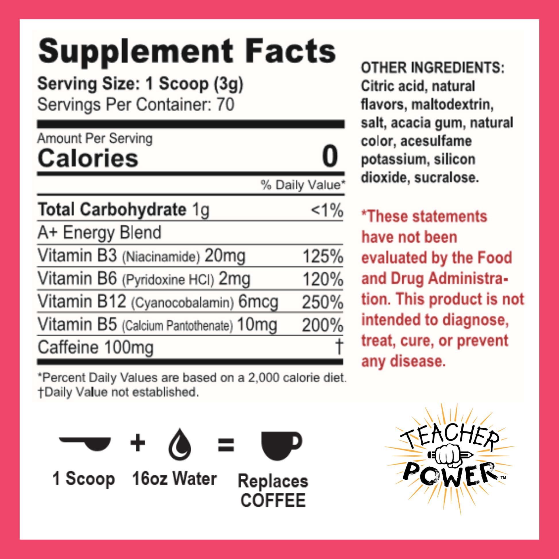 With simple ingredients and superb flavor delivered at less than 40 cents a serving, what’s not to love about Teacher Power’s energy drink mixes? When purchasing Teacher Power strawberry lemonade energy drink mix, you get: